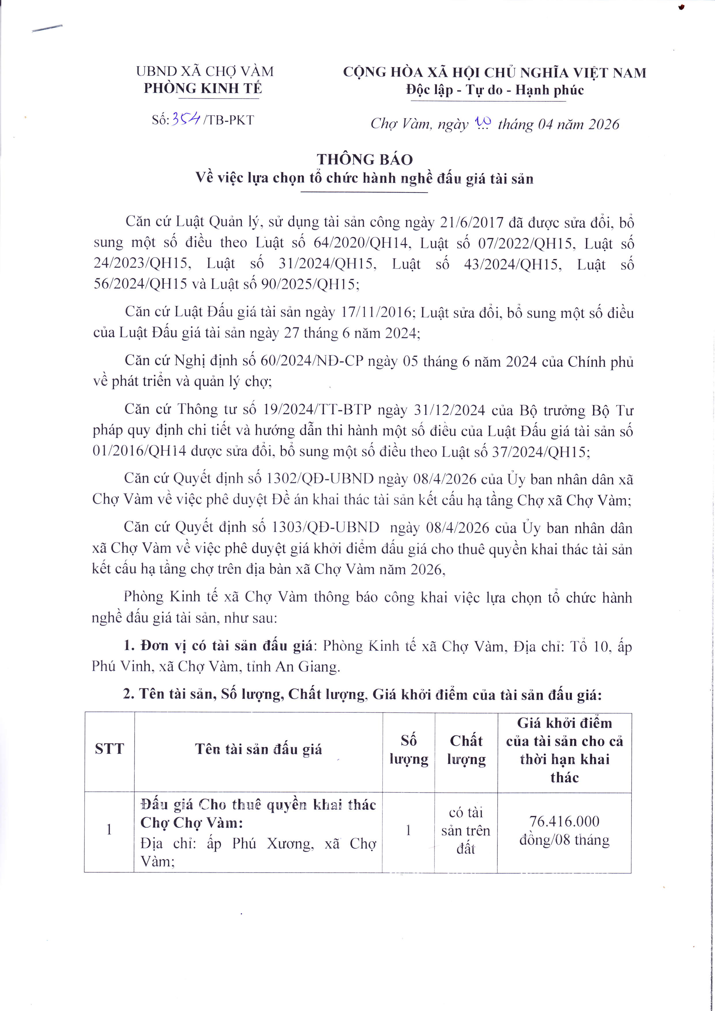 Sáng ngày 06/4/2026, Ủy ban nhân dân xã Chợ Vàm tổ chức lễ công bố và trao quyết