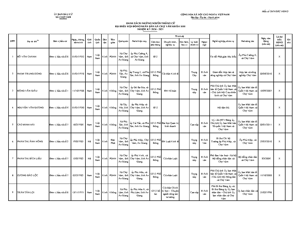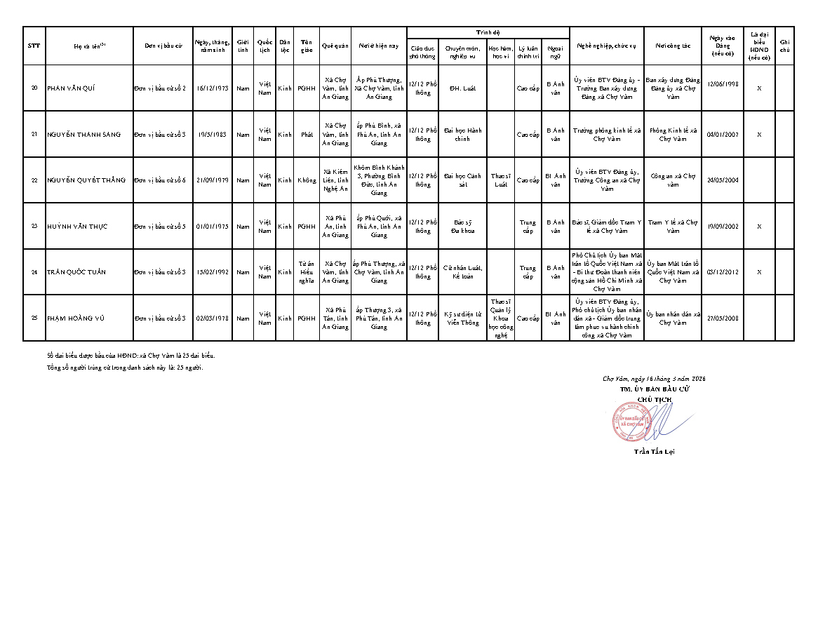 ỦY BAN BẦU CỬ XÃ CHỢ VÀM CÔNG BỐ DANH SACH 25 NGƯỜI TRÚNG CỨ ĐẠI BIỂU HĐND XÃ CHỢ VÀM NHIỆM KỲ 2026-2031.