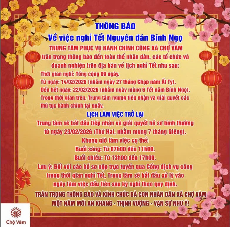 Thông báo làm việc Trung tâm PVHCC dịp tết nguyên đán 2026 Bính Ngọ