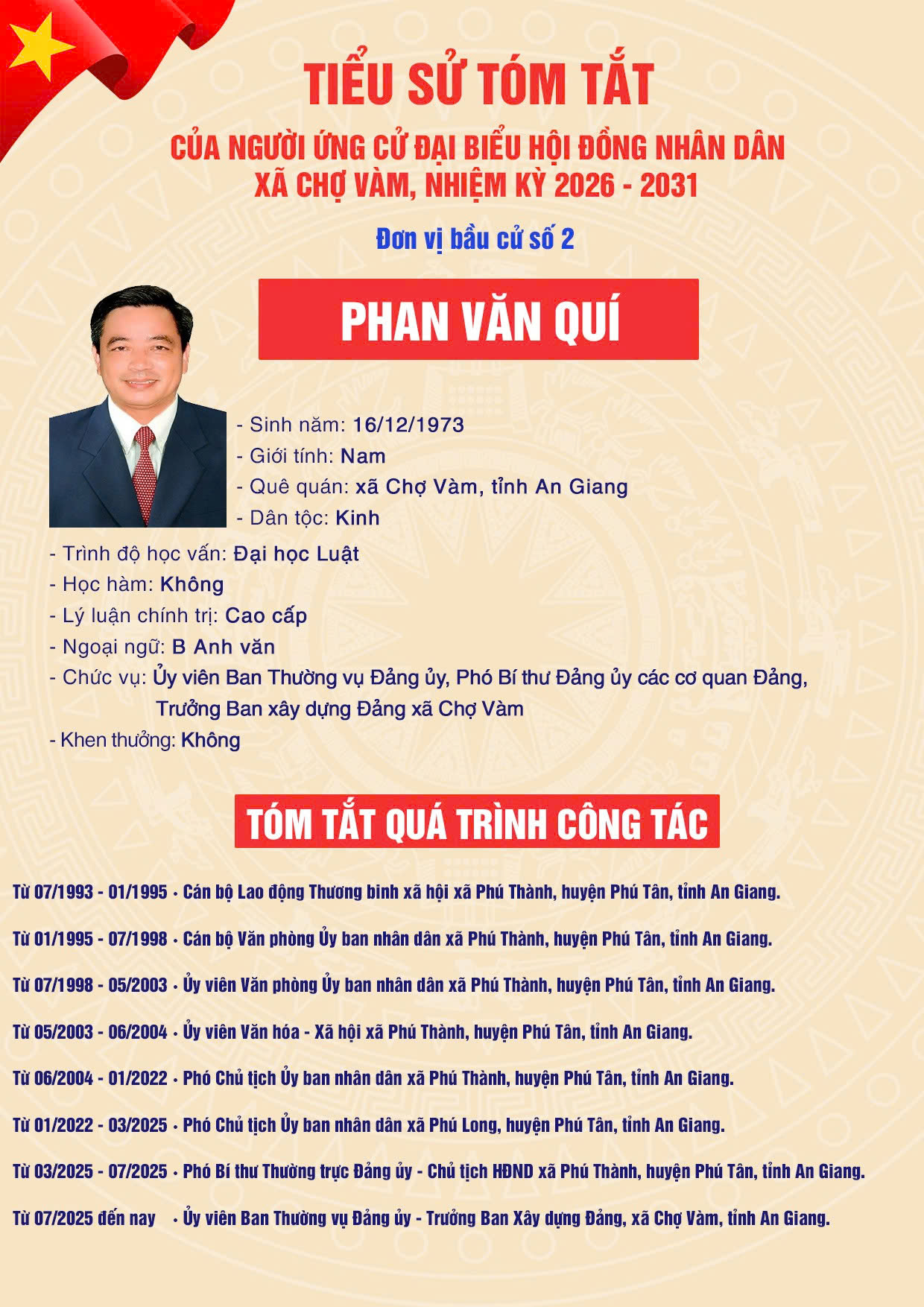 5. Ông PHAN VĂN QUÍ - Ủy viên Ban Thường vụ Đảng ủy, Phó Bí thư Đảng uỷ các cơ quan Đảng - Trưởng Ban xây dựng Đảng xã Chợ Vàm, tỉnh An Giang.