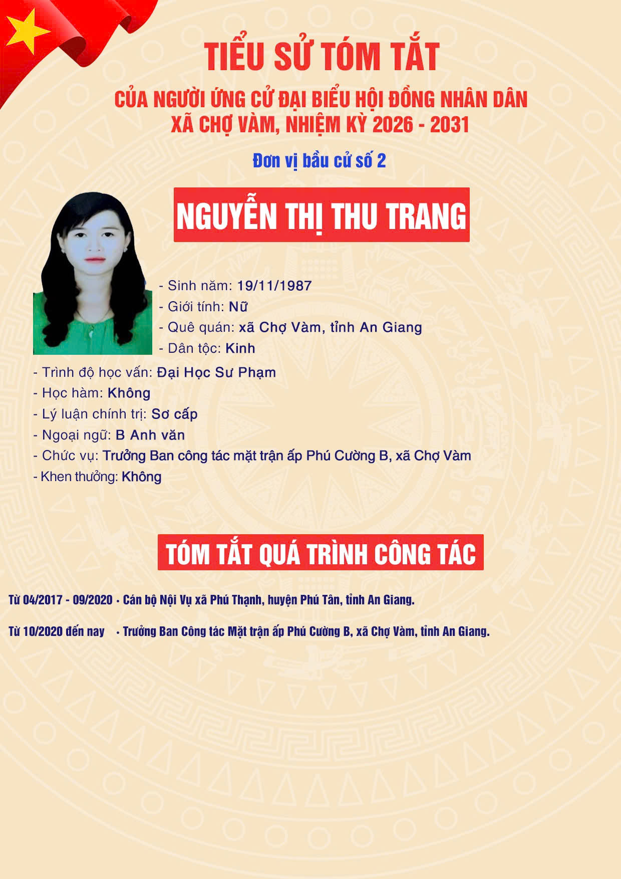 6. NGUYỄN THỊ THU TRANG - Trưởng Ban công tác mặt trận ấp Phú Cường B, xã Chợ Vàm, tỉnh An Giang.