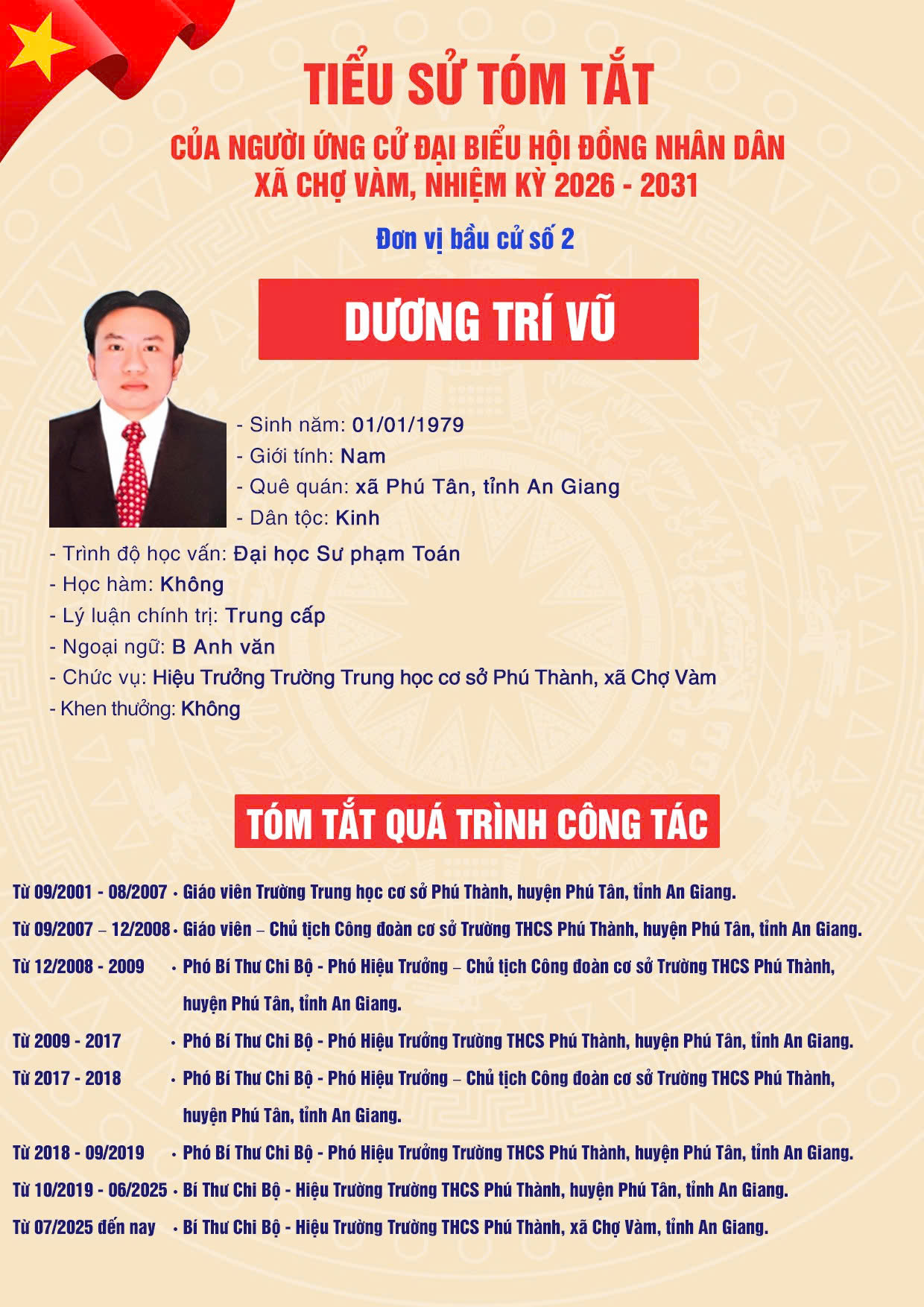 7. Ông DƯƠNG TRÍ VŨ - Hiệu trưởng Trường trung học cơ sở Phú Thành, xã Chợ Vàm, tỉnh An Giang.