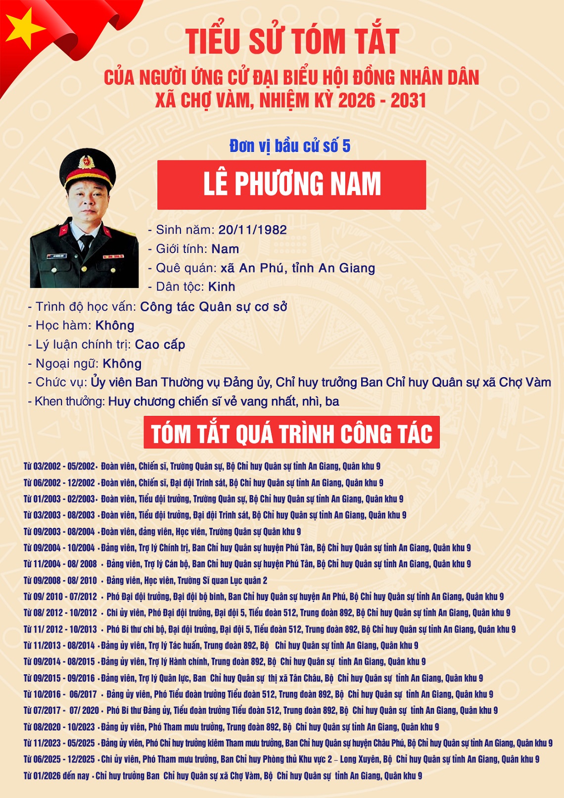 2. Ông LÊ PHƯƠNG  NAM - Ủy viên Ban Thường vụ Đảng ủy, Chỉ huy trưởng Ban Chỉ huy Quân sự xã Chợ Vàm, tỉnh An Giang.