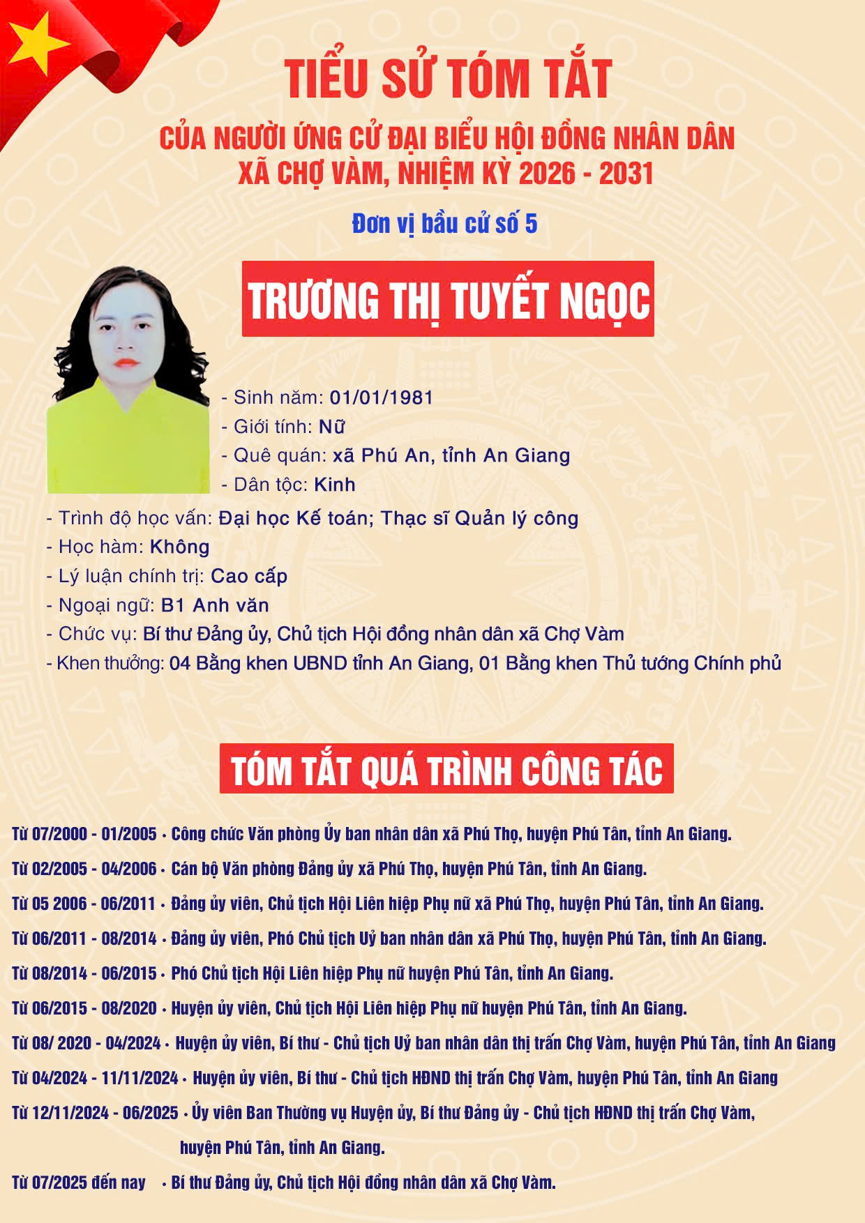 3. TRƯƠNG THỊ TUYẾT NGỌC - Bí thư Đảng ủy, Chủ tịch Hội đồng nhân dân xã Chợ Vàm, tỉnh An Giang.